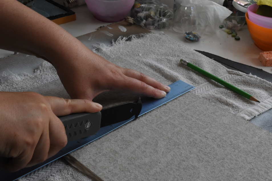Using a ruler or other straight implement as a guide, score where you want to cut using a scoring blade. To make accurate scores, use a decent amount of pressure and don't try to move the blade too fast. After the first score, you likely won't need to use a ruler to guide the blade, it should glide along the existing scores.